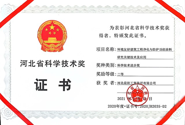 河北晨陽工貿集團有限公司《環境友好建筑工程凈化與防護功能涂料研究關鍵技術及應用》項目榮獲河北省科學技術進步獎二等獎。近年來,河北晨陽工貿憑借高質量創新成果的落地驗證和迭代升級,已多次獲得該項殊榮。