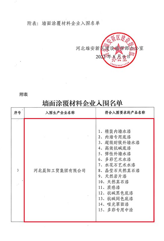 2022年8月9日,雄安新區(qū)建設(shè)指揮部辦公室發(fā)布了《關(guān)于發(fā)布增補入圍集采目錄墻面涂覆材料企業(yè)名單的通知》。據(jù)墻面涂覆材料企業(yè)入圍名單顯示:河北晨陽工貿(mào)集團有限公司(以下簡稱“晨陽水漆”)共計有15款內(nèi)外墻環(huán)保水漆產(chǎn)品入選。